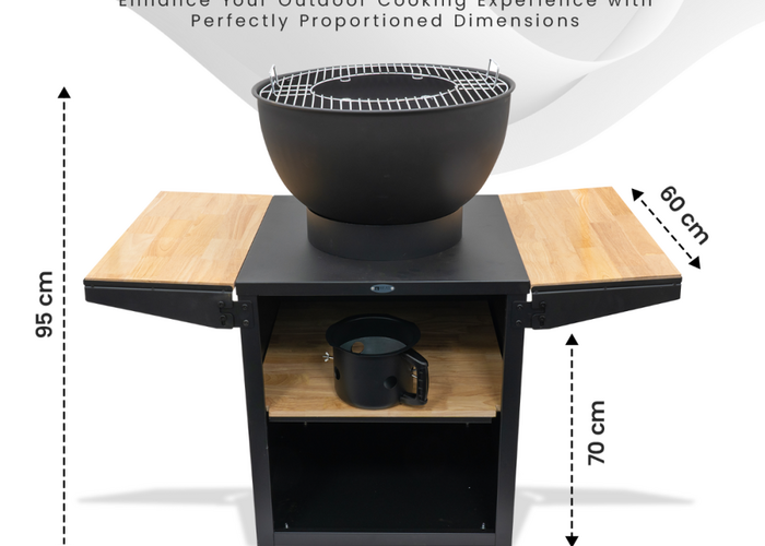 Уличная кухня Kjok — это компактная и полностью оборудованная кухня для приготовления на открытом воздухе. Готовьте самые вкусные блюда на жарочной плите с огнём на дровах. Благодаря двум удобным боковым полкам по 30 см каждая, у вас достаточно места, чтобы быстро что-то подготовить или расставить тарелки. Два просторных отделения для хранения позволяют держать все необходимые инструменты под рукой, а запас дров — поддерживать огонь на протяжении всего вечера.
